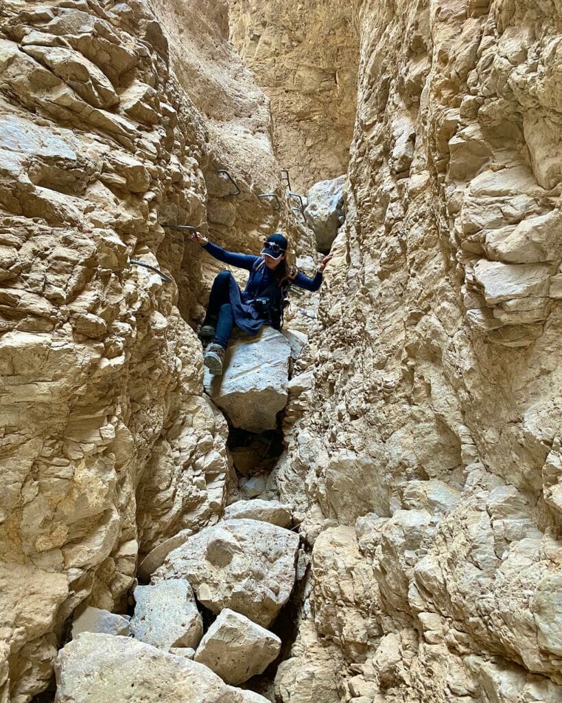 I touch hard rock, soft rock. I feel the stone on every part of my body as I throw myself in to the canyon dance. Down I go, activating my muscles to safely guide me through this stone playground. There’s even a slide.