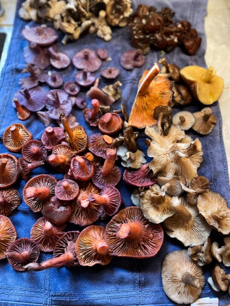 On a rainy January day, I wandered through a dark forest, over stones and moss and pine needles. My husband strolled nearby with our basket; our friends and guide, Ido, were somewhere out there too. We peeked under rocks and beneath piles of wet leaves like children on a treasure hunt, searching for edible treasures. The purple mushrooms were the most visually appealing, smooth and perfect, with lavender gills underneath. Despite their beauty, they bore the distinctly unattractive name of “Blewits.” Along with the purple blewits, we gathered orange-y red mushrooms, rubbery beige ones, giant milky yellow types, and dark brown ones that grew on trees and looked like snails.