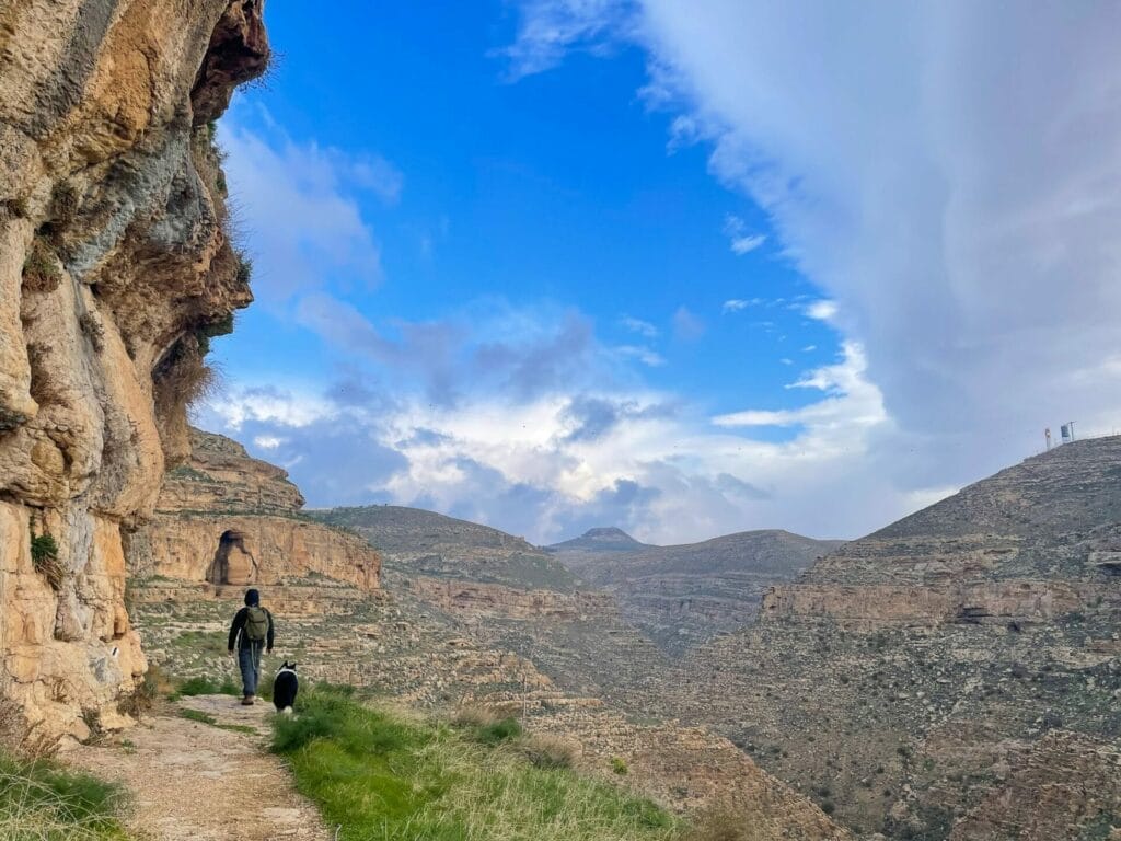 We pass by the Haritoun cave and keep going, past the spring, past little purple wildflowers, over an incredible gaping valley. “Over here,” I tell our two boys in the front, “It’s that cave right up there – you guys go in. I’ll be there in a minute.”