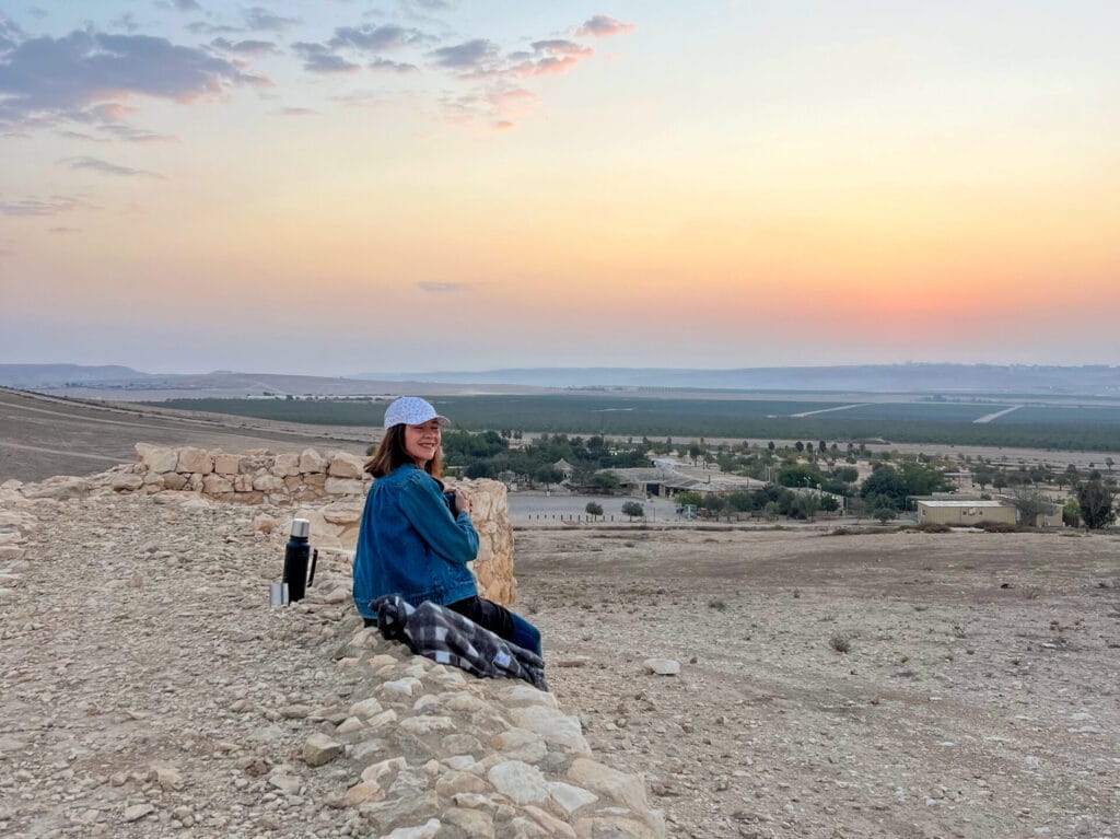 The weather was perfectly cool, and we watched as flocks of birds circled in the sky, past puffy little clouds in shades that could only be described as magical. In the distance, desert dunes glowed gold on one side while the city of Arad twinkled on the other.