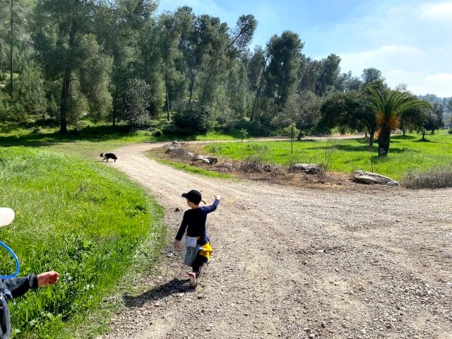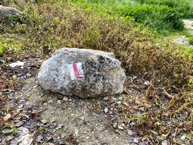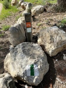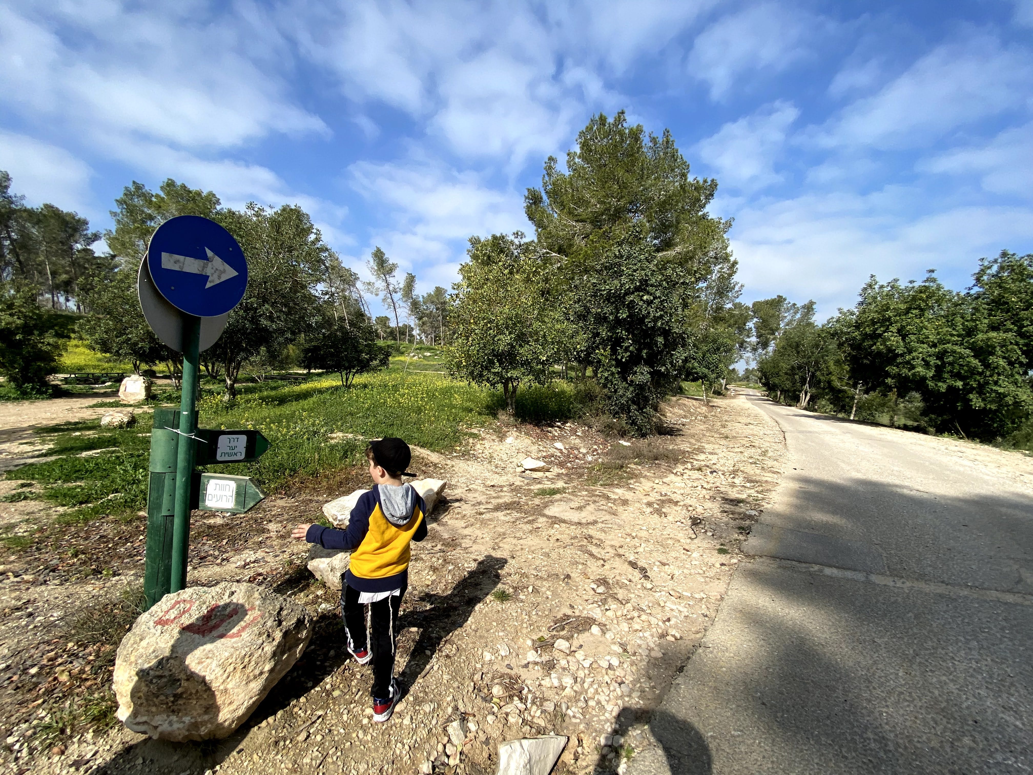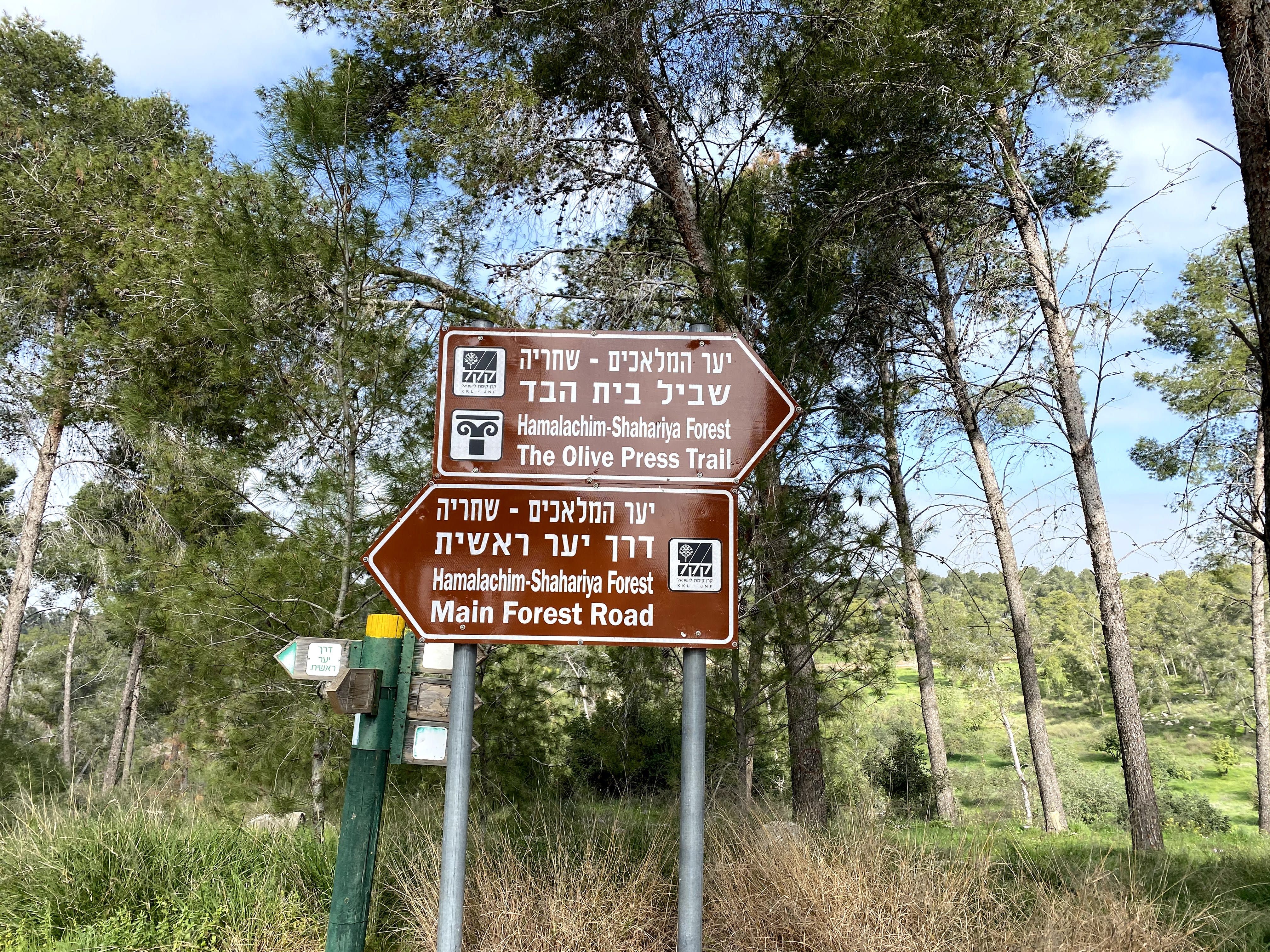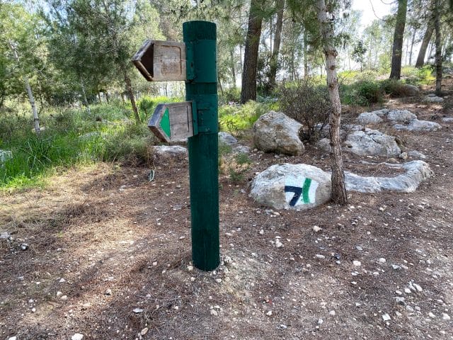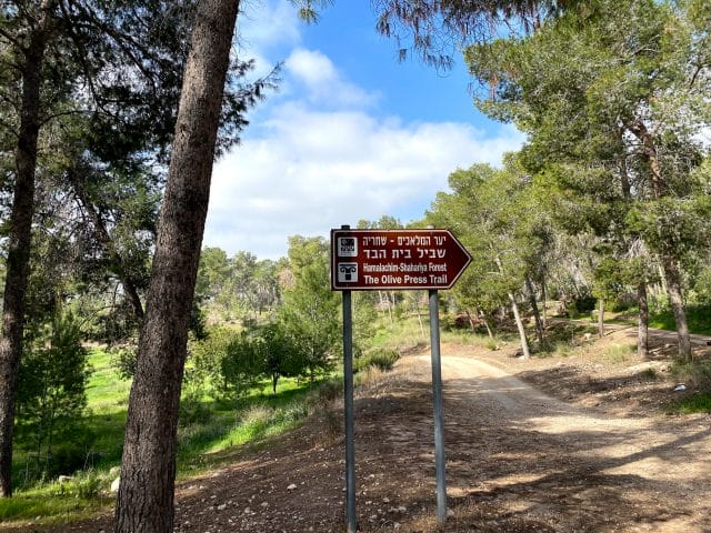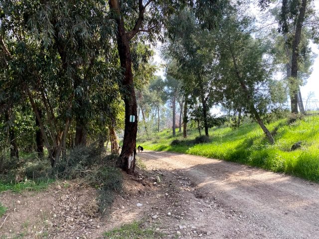 Park here.Begin on the red trail.After a couple of minutes, make a left onto the blue trail.Follow the blue trail. The trail markers are not always clear, but if you just stay with the path you should be fine.At the end of the blue trail, make a quick right onto the red trail.Make a left onto the green trail. The green trail leads along a dust road.Follow the road straight on the green trail at this crossroads (Don't turn right or left).At the picnic area, make a right to follow the green trail.Follow the green trail to the right towards the Olive Press Trail.Follow signs for the Olive Press Trail.Signs on the olive press trail. To follow path, look for black trail markers.These are the black trail markers to follow to get onto the Olive Press Trail.Black trail markers on the olive press trail.When you finish the Olive Press Trail, make a right onto the green trail.Continue to follow the green trail.At this crossroads, make a left to follow the path towards the trees.Follow the green trail.This is where you depart from the green trail for a few minutes. Instead of making a left, follow the dirt path straight.Continue following the path straight. Soon you will reach this road which you will follow for a while.This is where you get off of the road. Follow the dust path instead.Follow the unmarked dust path. This trail will take you all the way back to your car.