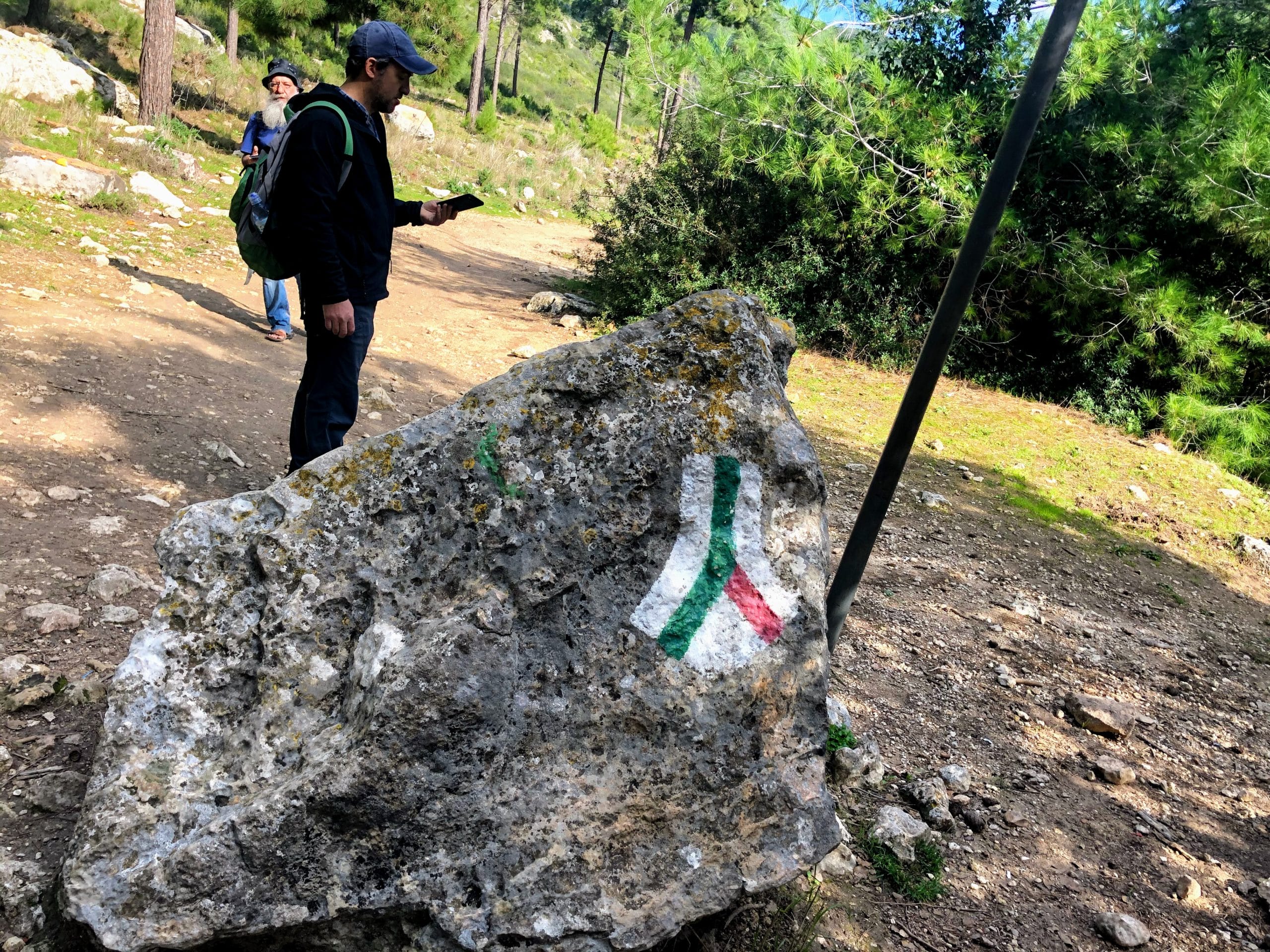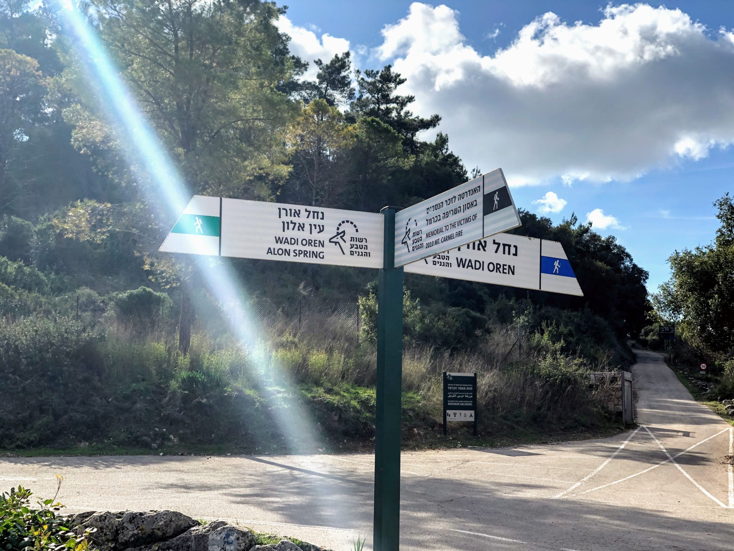 Kelah to Oren Park in Mt. Alon Campground and head towards the higway.Make a left out of the parking lot and follow the highway.Follow the road on the left hand side at the fork.This is where you make a right off the road into the trees. There's no marker here, but you'll find the the blue trail right down below.You will have passed this sign when you are ready to make a turn off the highway (as seen looking back from where you turn).Follow the blue trail down and through Nahal Kelah.When you emerge from Nahal Kelah, make a left over the bridge.When you emerge from the Nahal, cross the bridge and make a right onto the red trail.Follow the red trail.Cross the road to get onto the black trail.Follow the black trail.The memorial near Beit Oren. On the other side of the memorial you'll find the continuation of the black trail.On the other side of the memorial, you'll find the continuation of the black trail. Follow it down through the trees.When you reach the crossroads, make a left into Nahal Oren.Follow the green trail through Nahal Oren.Make a left towards Nahal Alon and follow the blue trail.Follow the blue trail up the mountain and back to the parking lot.