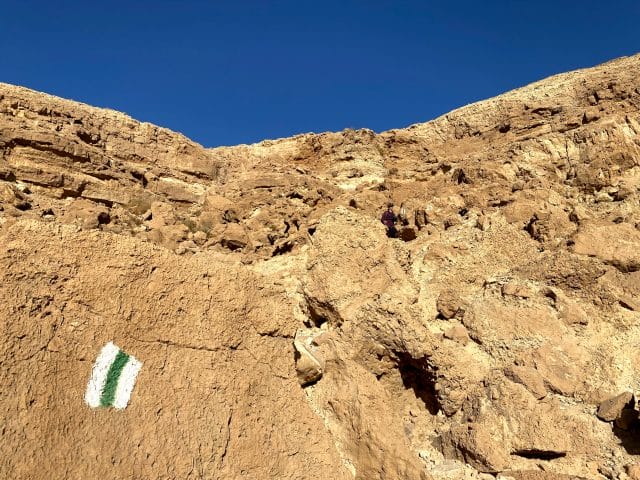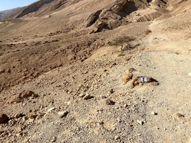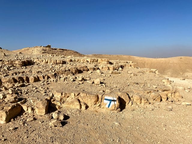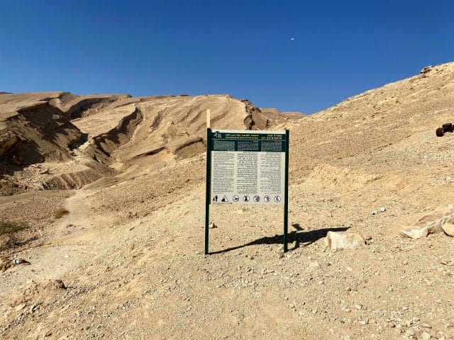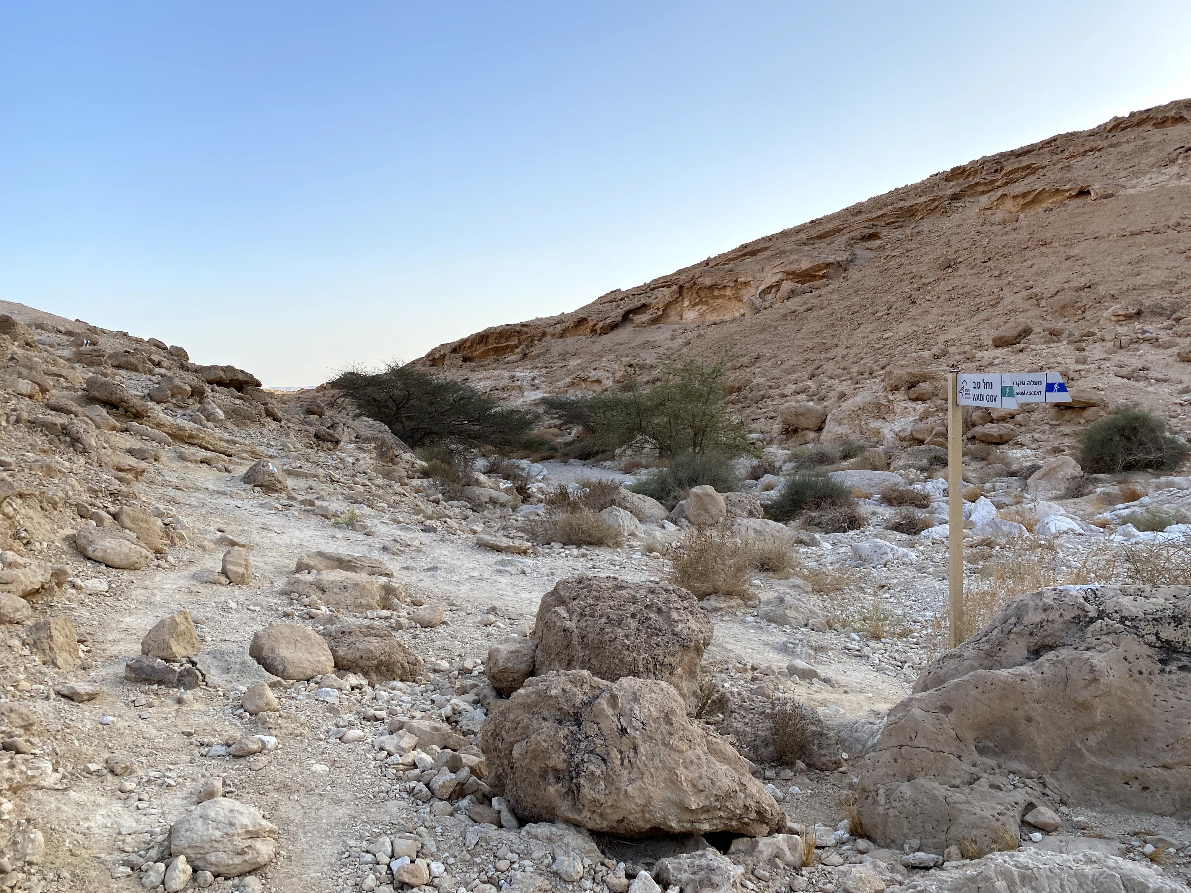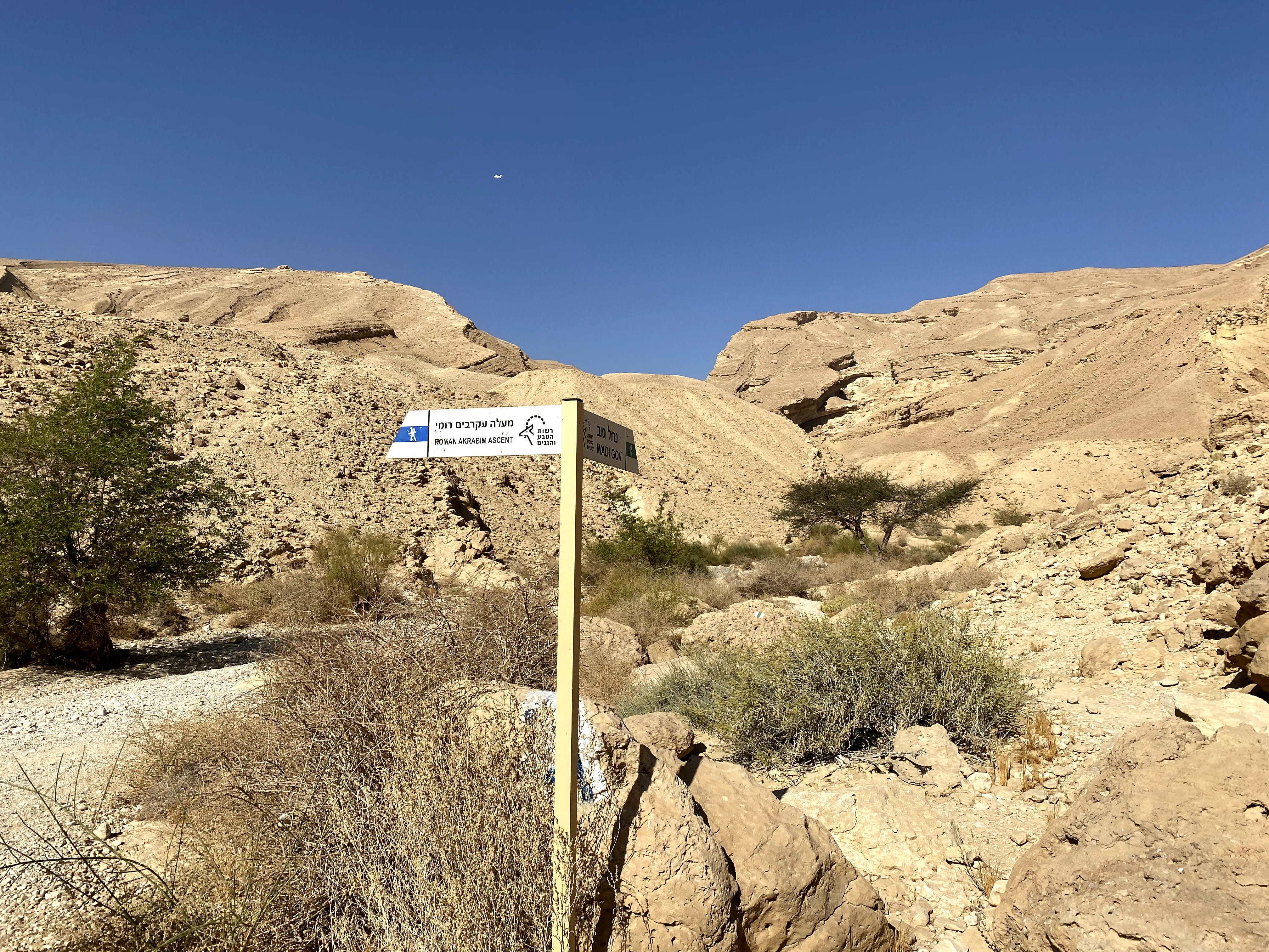 Ma’ale Akravim and Nahal Gov Follow the blue trail towards Ma'ale Akravim (Aqrabim Ascent).The sign at the trailhead.Follow blue trail markers all the way up the mountain.Stay on the blue trail.After you ascend for a while, stay on the blue trail.When you reach this crossroads, follow the red trail up the hill to see the fortress, then return to the blue trail.When you reach this crossroads after the fortress, get onto the black trail.Follow the black trail until you reach the green trail.Turn right on the green trail and follow it downhill.The green trail will take you all the way through Nahal Gov. At the end, turn onto the blue trail to return to the trailhead.The blue trail will return you to the traihead.