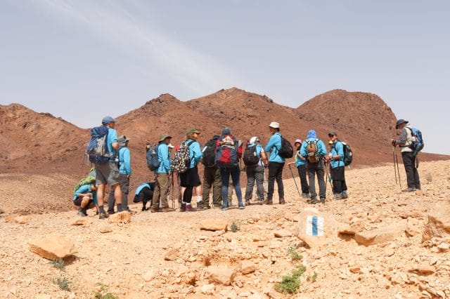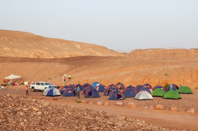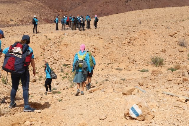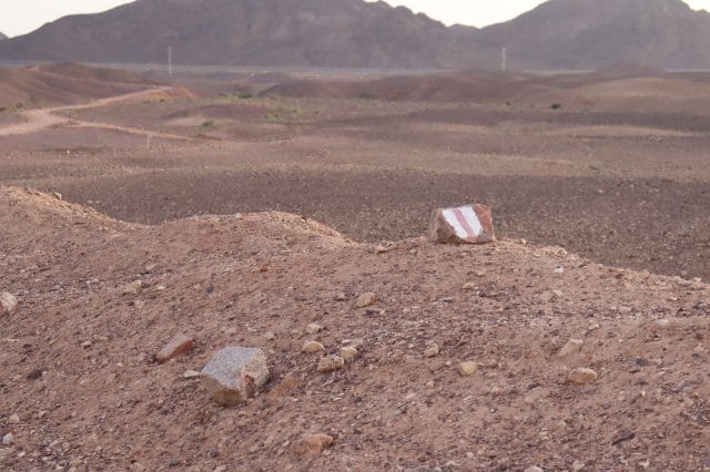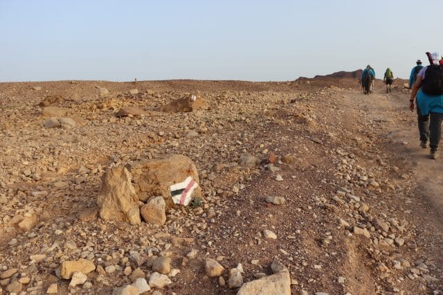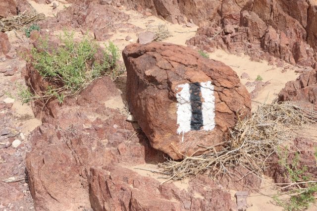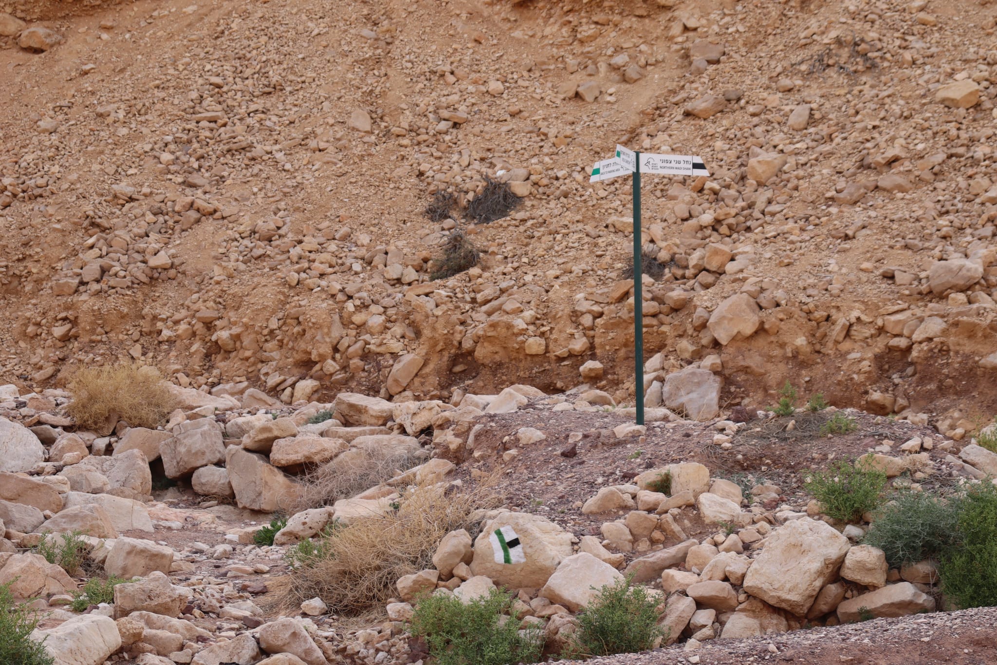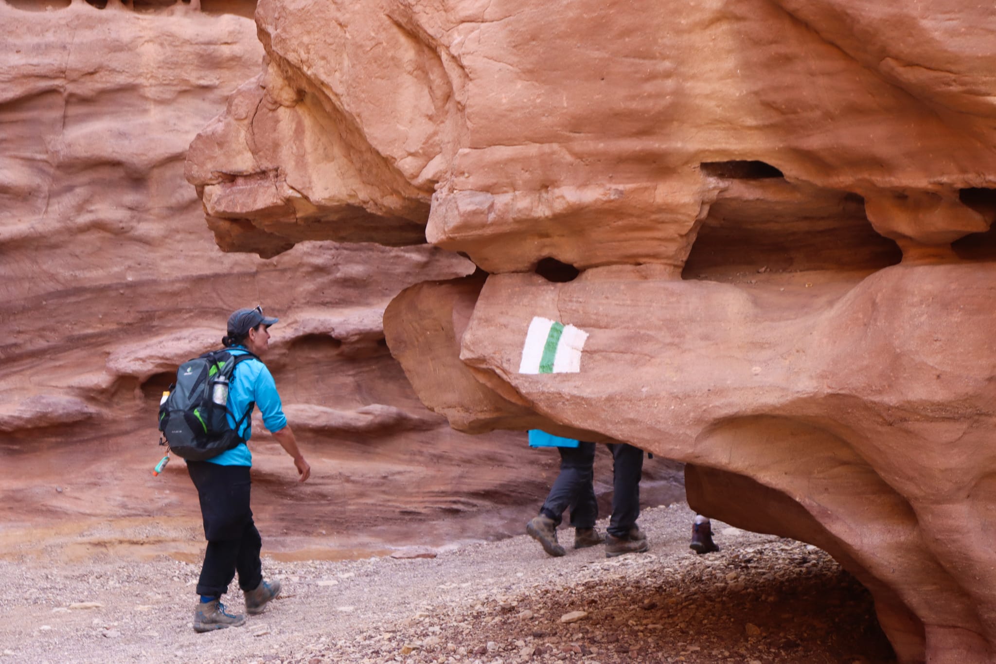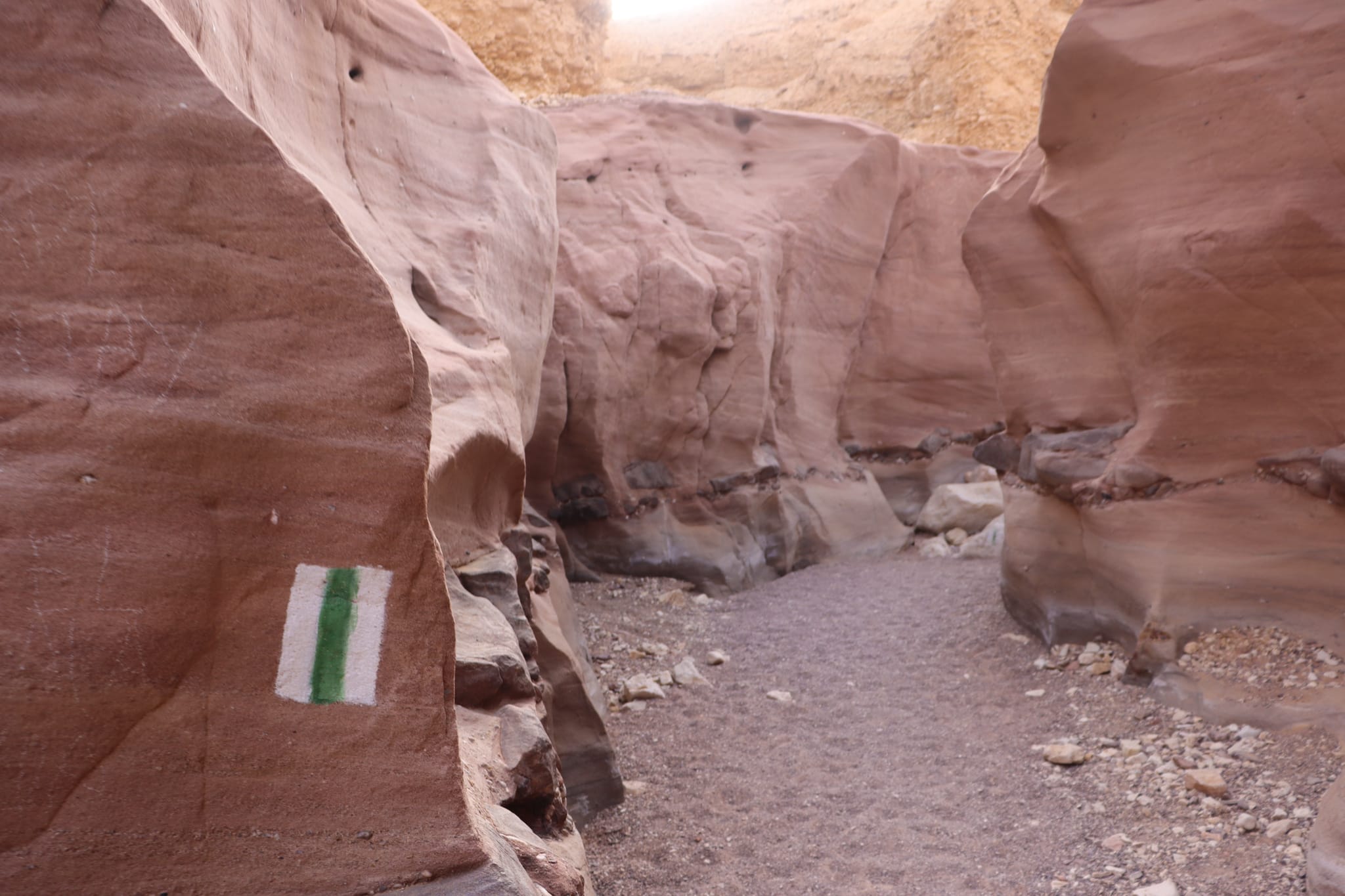 Mount Neshef and the Red Canyon Begin by following this blue trail.The blue trail will lead up Mount Neshef.Follow blue trail markers.Make a right onto the black trail.Follow the black trail past the red trail.When you reach the green trail, make a left to follow it into Nahal Shani.Follow the green trail through Nahal Shani and the Red CanyonGreen trail.When you reach the black trail, you can make a right to follow it to extend the hike. Following the green trail will take you straight to the end.Following the black trail.When you reach the red trail, make a left. The red trail will take you to the campground.Red trail to the campground.Campground at the Red Canyon.