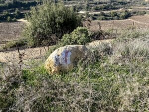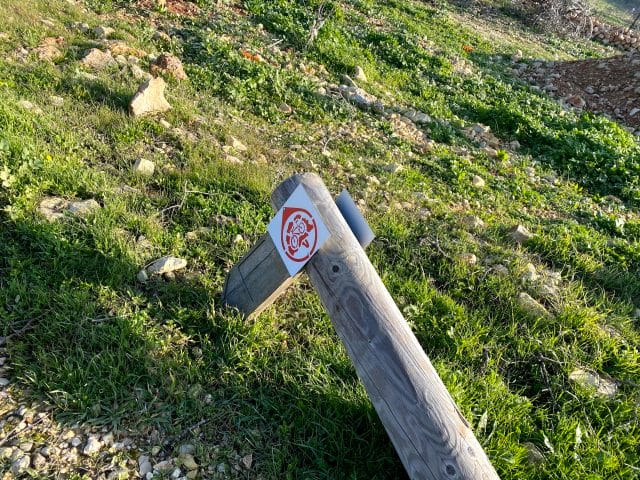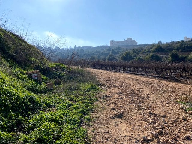 After the entire loop, including the springs, fields, and forests, you will reach this vineyard where the cycling trail continues to the right. Here, turn left to approach the Three Boys Lookout.