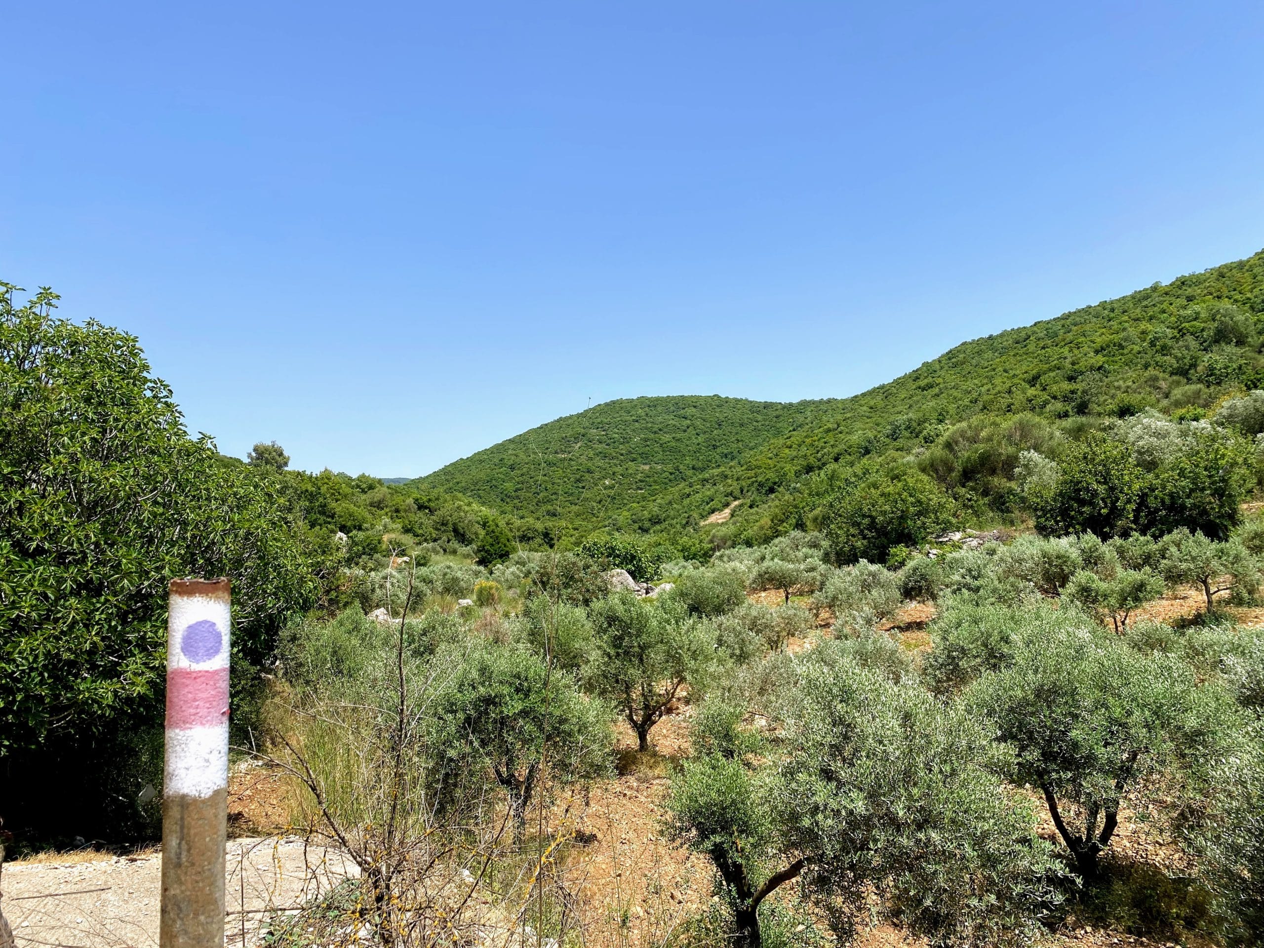 Yam El Yam Day 2 1. Back on the highway from the campground, locate the turnoff on the left to the red trail.2. The red trail.3. After a short while on the red trail, you'll reach the green trail. Follow green.4. The green trail leads through a beautiful area.5. Continue following the green trail. Keep a close eye out for trail markers.6. The green trail. Always follow the trail markers.7. Still following green.8. The highway where the gas station for water refills is located. Follow the instructions in hike notes to get to the highway.9. After a looong walk on the green trail, turn right onto red.10. Soon you'll reach the turnoff to the Israel Trail and black trail. You will follow the Israel trail for the rest of the hike.11. The black trail. This is the trail you'll take up the mountain.12. Turn left onto the red trail.13. When you reach the top of the mountain, continue to follow the Israel Trail.14. Follow the Israel Trail/ Green trail.15. From here, both the Israel Trail and the blue trail will take you to the same place - the campground at Meron.
